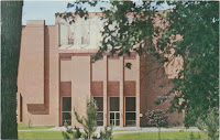 When we first moved to town, I was in grade school, and we rented a dandy old house which had several urinals in the upstairs bathroom, a fire escape from the attic, and a gazillion fruit trees to climb in the side and back yards, all less than a block from that old gymnasium. There was a modern men's dormitory between us and it: the First Architectural Abomination, Gibson Hall. It strongly resembled a modern motel (prompting several students to cross state lines, to steal a semi-portable Holiday Inn sign to put on display during the formal dedication ceremony), and, while it stuck out like a sore thumb next to our mostly neoclassical structures, it also served as an excellent playground for pre-teen me and my pre-teen pals. We raced and climbed all over its concrete & I-beam balconies and slid down the muddy hill beside it. During a later summer, I earned a paycheck or two applying fresh paint to its walls, ceilings, doors, and beams.